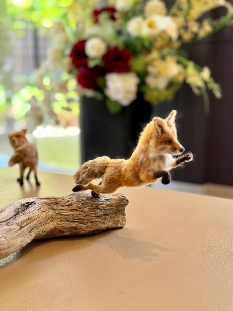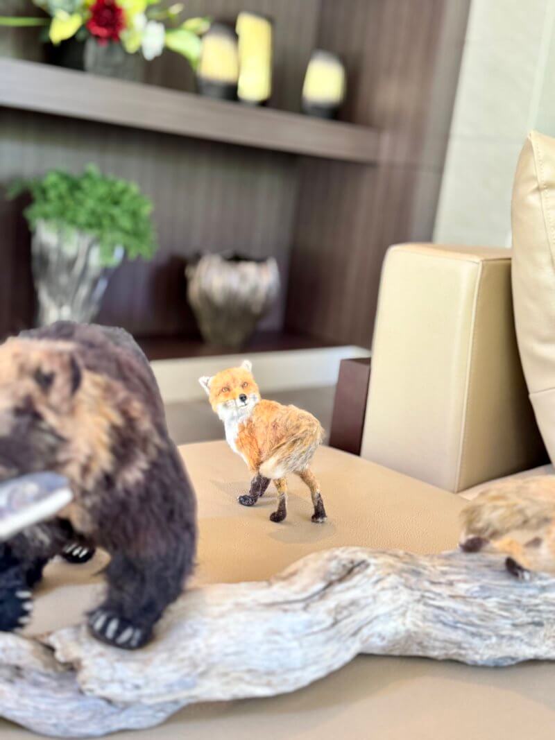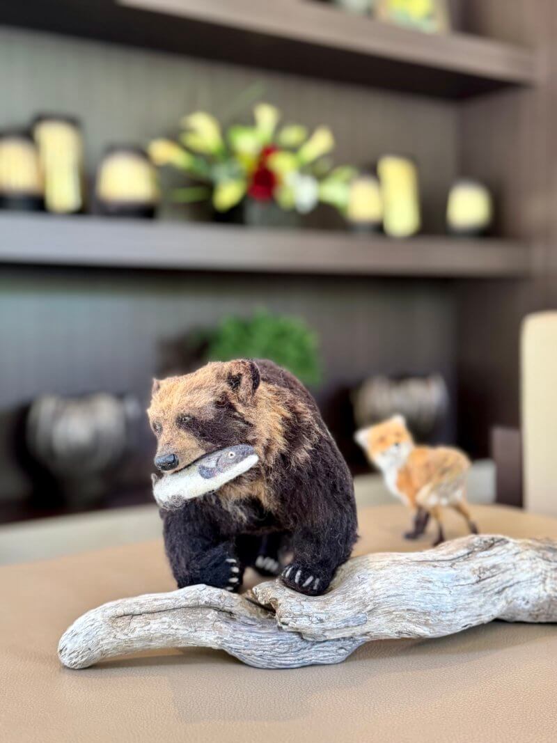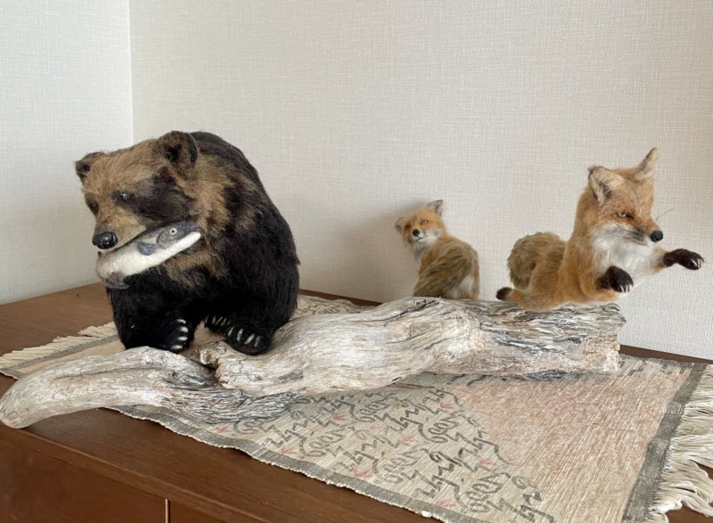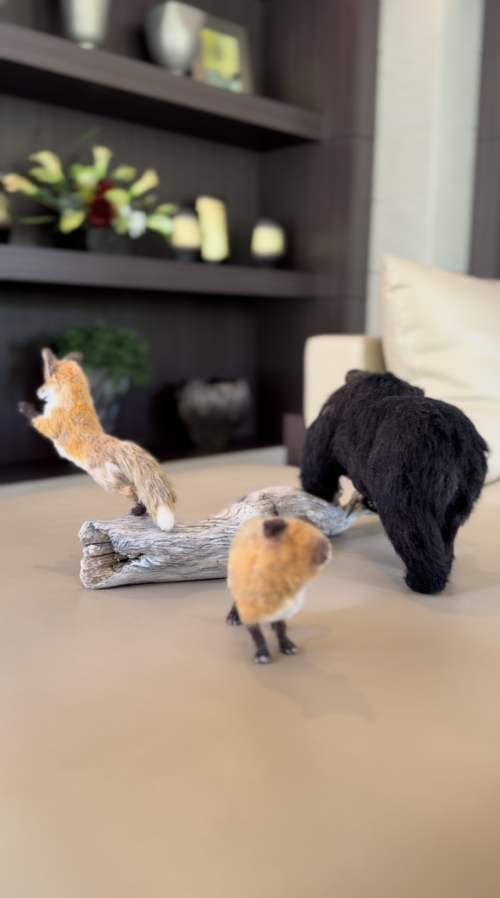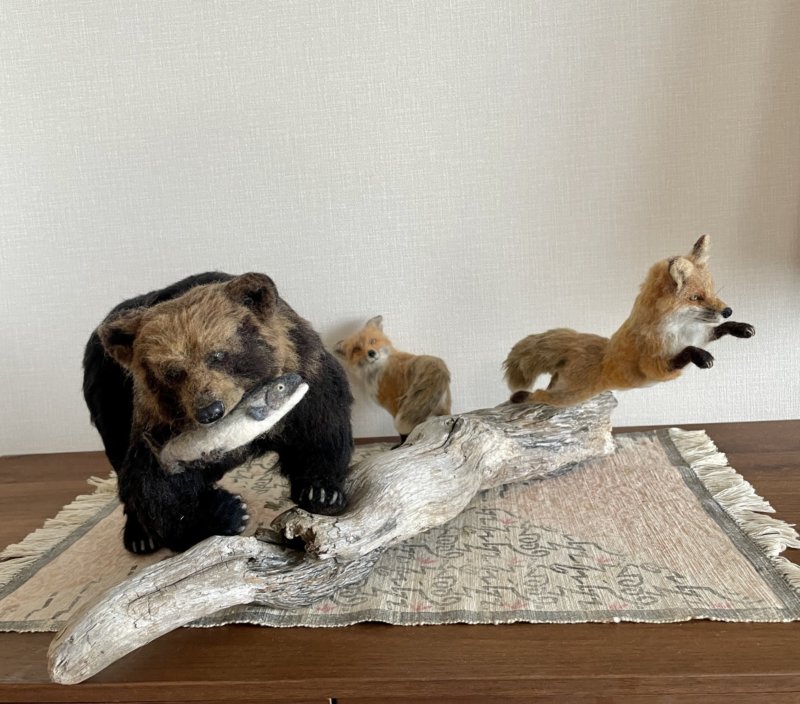 羊毛フェルトの羆とキツネの秋