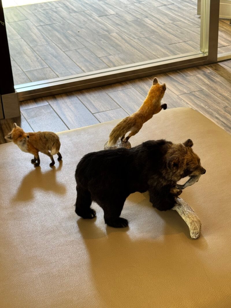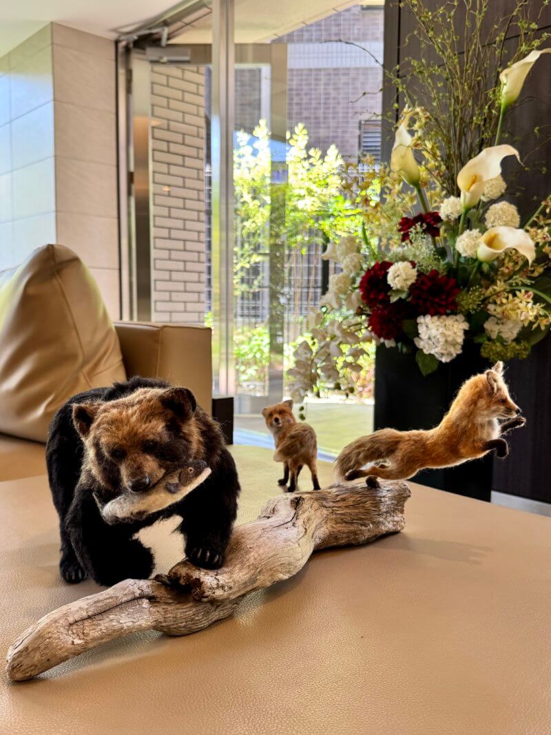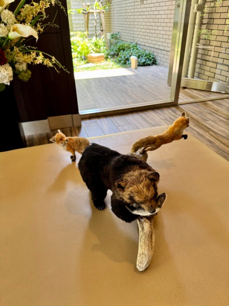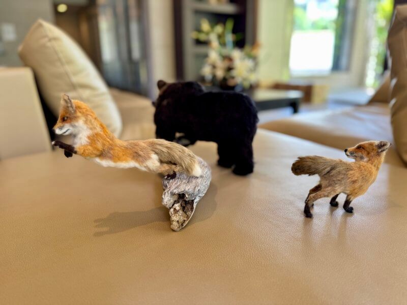 重量感のあるヒグマと並ぶのは、躍動感ある2匹のキツネ。